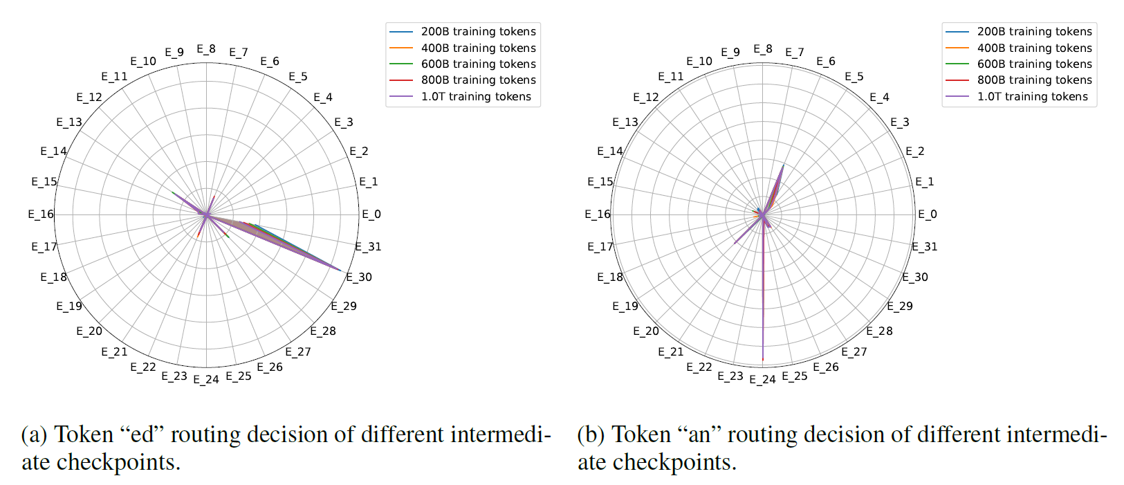 specialization is established early in pre-training and remains largely fixed, resulting in tokens being consistently processed by the same experts throughout the training; (在前期的batch即确立这种关系,微调也不会改变)