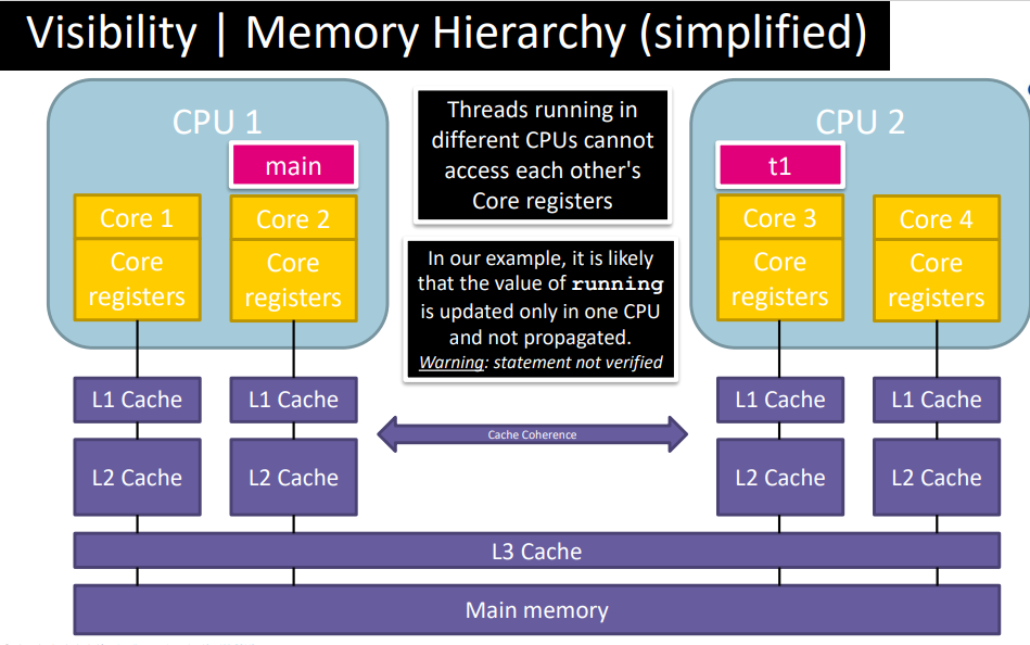 - To increase performance (hardware optimizations), in the absence of synchronization operations, the CPU is allowed to keep data in the CPU’s registers/cache ==> it might not be visible for threads running on different CPU. [ More precisely, in the absence of a happen-before relation between statements of different threads, it is not guaranteed that they will see the same shared memory state ]